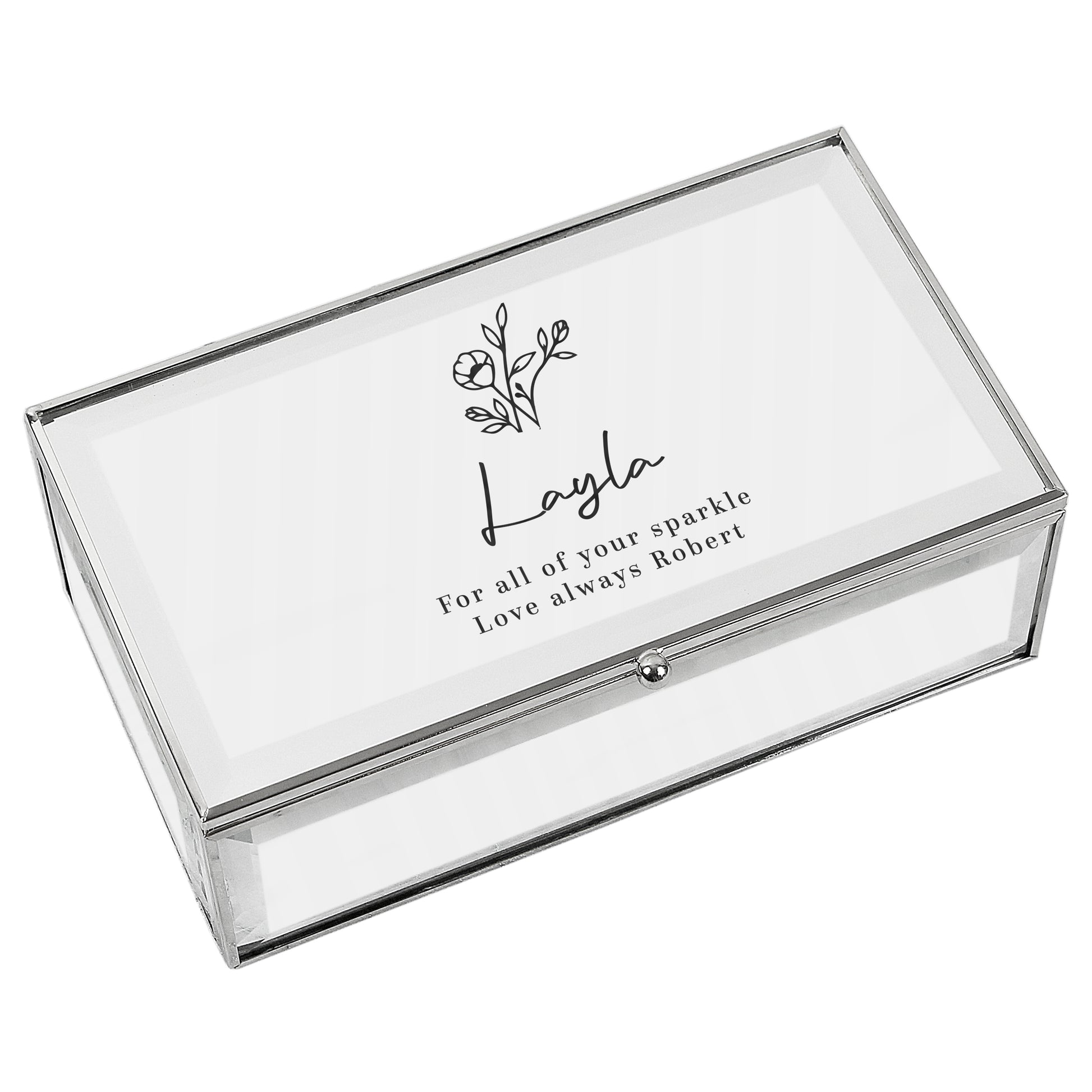 This clean modern Personalised Floral design jewellery box with mirrored finish, features three compartments to store your jewellery.