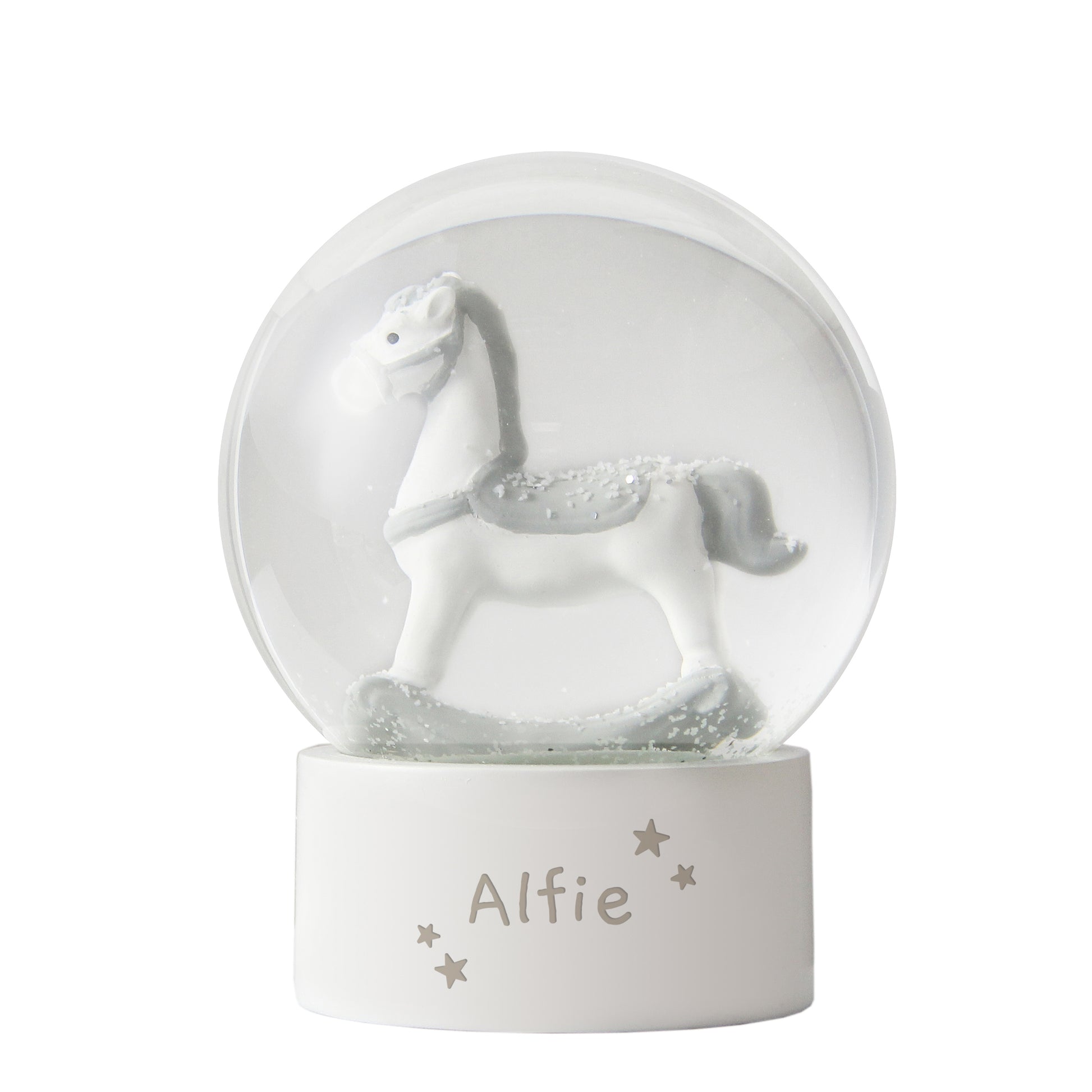 Personalise this ornamental rocking horse glitter snow globe with a name up to 12 characters long.