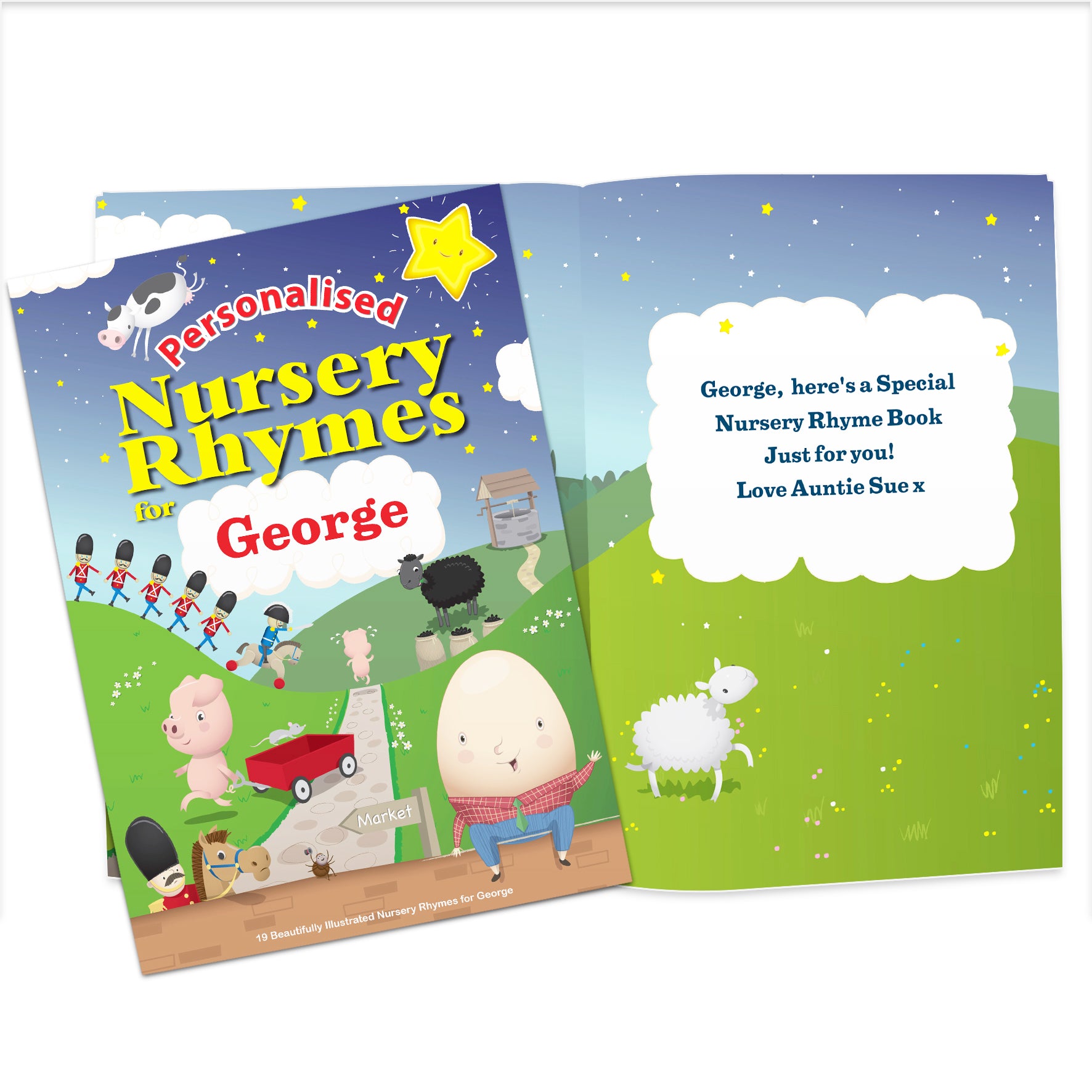 Our personalised Nursery Rhyme Book contains 19 beautifully illustrated popular nursery rhymes, each personalised with a child's name, making it a perfect gift for a 1st Birthday, Christmas, New Borns and Christenings. The bright and colourful illustrations are sure to inspire their imaginations and provide hours of fun!